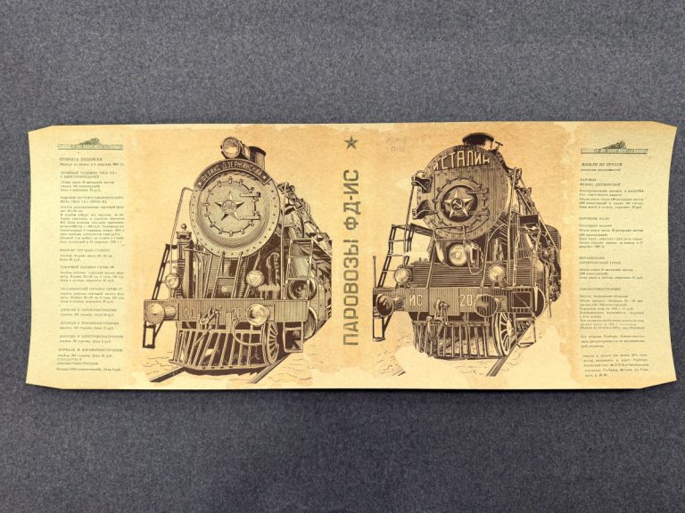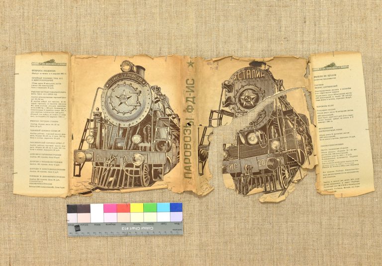 Во время моего посещения специалист Центра реставрации Светлана Фурманова, закончившая магистратуру на Химфаке ТвГУ подрезает края отреставрированной суперобложки (той, что поверх переплёта) книги «Паровозы ФД-ИС» 1935 года. Сравнивая фото «было» и «стало», вижу, как исчезла грязь, как «срослись» порванные лоскуты бумаги. Теперь книгу с такой обложкой можно не только брать в руки, но и спокойно выдавать из хранилища читателям. В общем, «наш паровоз вперёд летит!..».