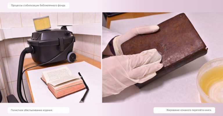 Процессы стабилизации – обеспыливание и жирование. Фото: архив Центра реставрации библиотеки имени Горького.