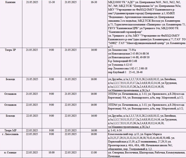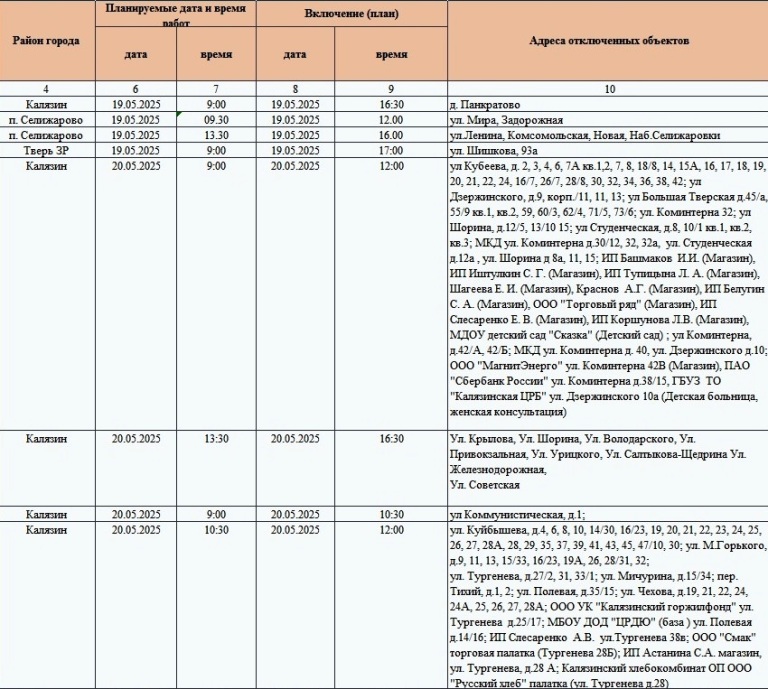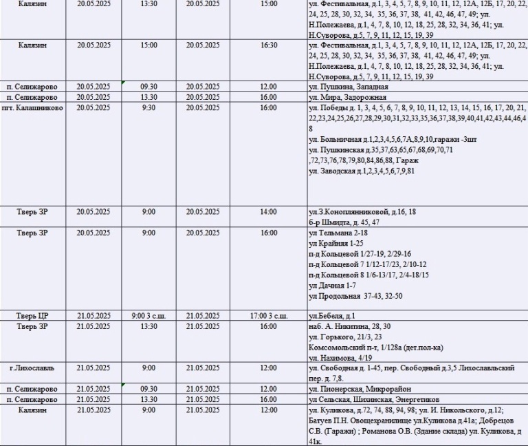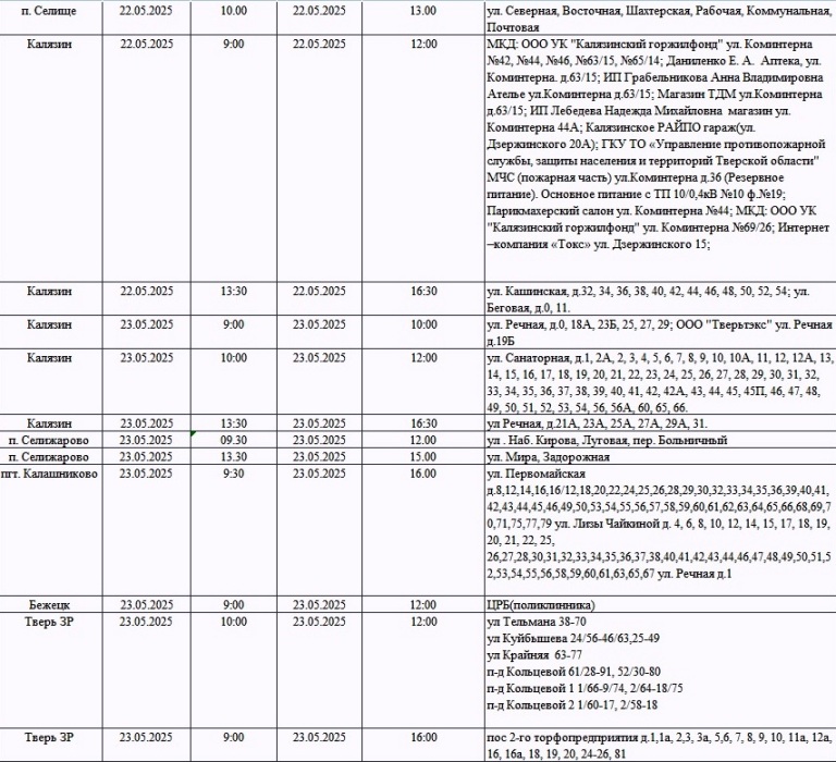Тверьгорэлектро информирует жителей Твери о плановых отключениях электричества в городе на текущей неделе. Отключения пройдут с 19 по 23 мая.