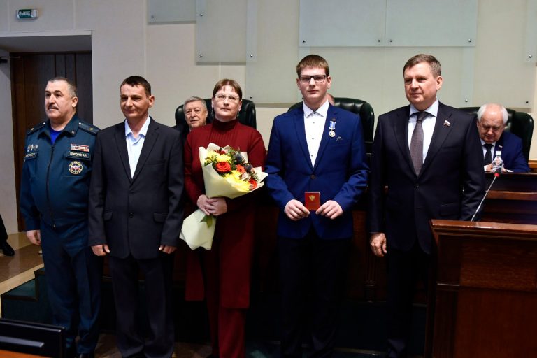 На заседании Законодательного Собрания Тверской области состоялось вручение памятной медали Совета Федерации «За проявленное мужество», которое провели сенатор Российской Федерации Андрей Епишин и начальник Главного управления МЧС России по Тверской области Арсен Григорян.