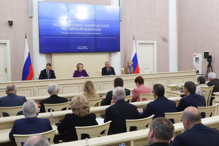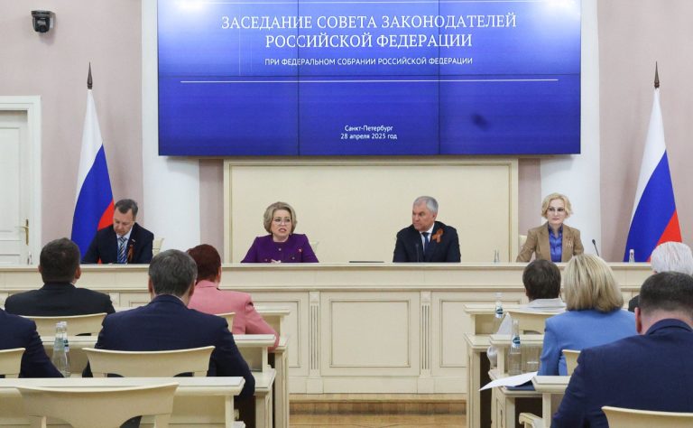28 апреля в Таврическом дворце Санкт-Петербурга прошло заседание Совета законодателей Российской Федерации при Федеральном Собрании Российской Федерации. На повестке дня было обеспечение региона квалифицированными кадрами в здравоохранении и образовании, а также тема противодействия нацизму и сохранения исторической памяти о Победе в Великой Отечественной войне. Мероприятие провели сопредседатели Совета законодателей – Председатель Совета Федерации Валентина Матвиенко и Председатель Государственной Думы Вячеслав Володин.