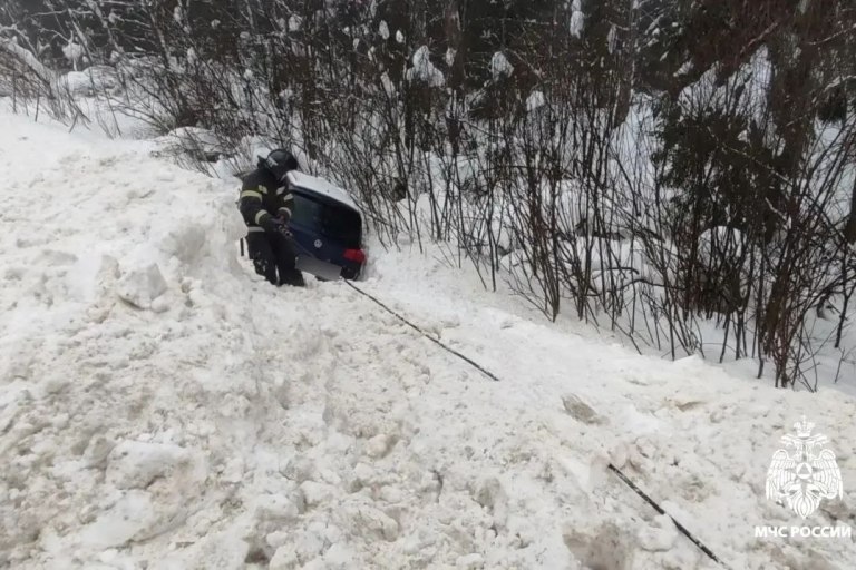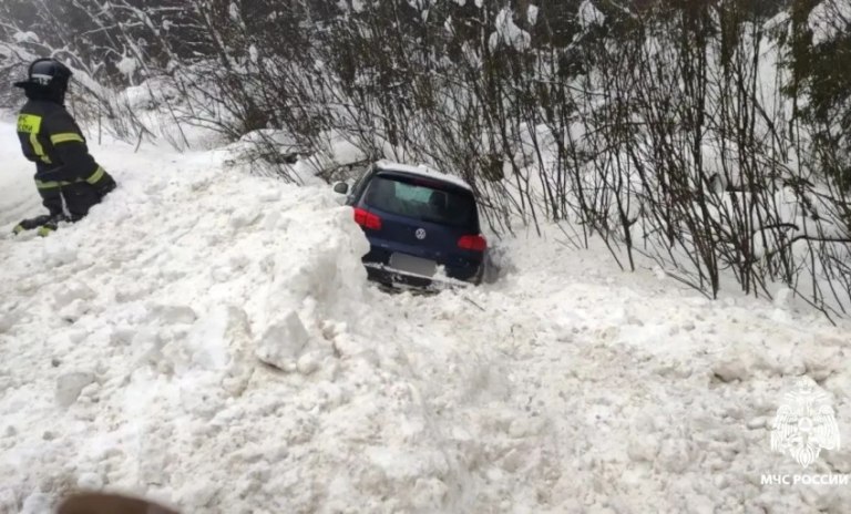 В итоге на место были вызваны сотрудники МЧС — прибывшие спасатели ПСЧ №12 освободили машину от снега и при помощи автоцистерны вытащили Volkswagen на дорогу.