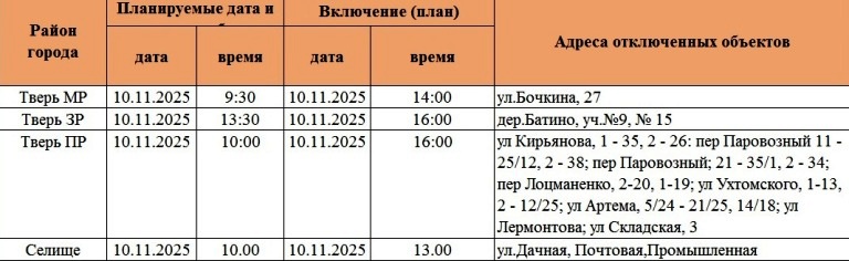 Стало известно, какие районы Твери и области останутся без света 10 ноября 09 ноября 2025, 09:19 Tverigrad.ru в: Отключения будут носить плановый характер. АО «Тверьгорэлектро» проинформировало жителей об грядущих плановых отключениях электроэнергии в Твери и области 10 ноября. Если вы нашли ошибку, пожалуйста, выделите фрагмент текста и нажмите Ctrl+Enter. 613 Ошибка в тексте? Выделите ее и нажмите Ctrl+Enter. Спасибо! Telegramm Главное ЖКХ #отключения электричества Рекомендации: rec 390977tut Всё для опытных и начинающих дачников: «Флора» приглашает на садовую ярмарку 28 января 2021, 10:00 КОММЕНТАРИИ 0 Войти Для комментирования Вам необходимо авторизироваться.