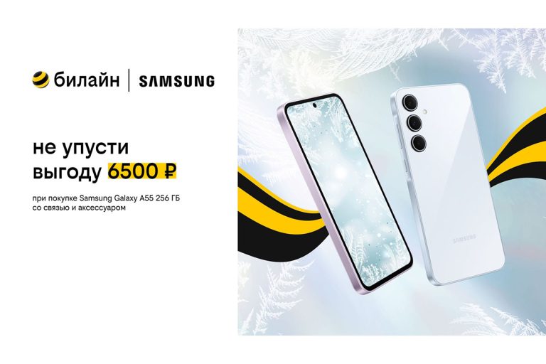 В рамках акции «Топим лёд выгодами» в билайне смартфон Samsung Galaxy A55 256 ГБ можно приобрести в комплекте со связью и аксессуаром с выгодой 6500 рублей. Это отличная возможность стать обладателем современного устройства или порадовать близких подарком с выгодой.