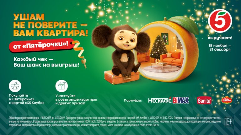 В сети российских супермаркетов «Пятёрочка» 20 ноября стартовала предновогодняя акция «Ушам не поверите – вам квартира!». Её главный герой – любимый персонаж из детства – Чебурашка.