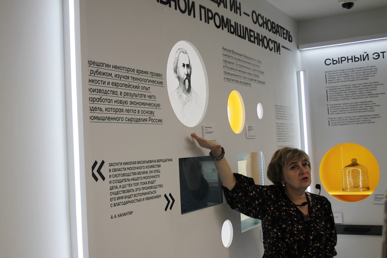 Экскурсовод Наталья повествовала о начале сыроварения в России, которое, к гордости тверских журналистов, берёт начало в Тверской губернии. В конце 60-х годов прошлого века общественный деятель, дворянин Николай Верещагин, организовал в Едимоново артельные сыроварни, такие же, как до этого он открывал в Твери. Там он учил крестьян и развивал новую для тех мест отрасль. Кстати, его сыр оценил даже Дмитрий Менделеев.