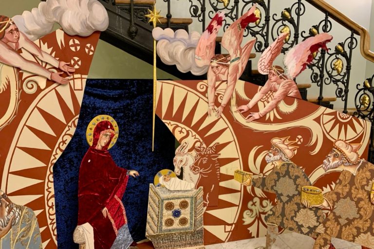 На первом этаже Западной башни дворца установлена композиция «Рождественский вертеп».