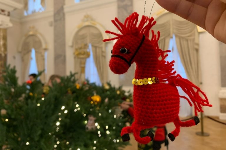 «Королева декора – наша елочка. Многометровая красавица украшена десятками метров гирлянды и самыми разнообразными игрушками. В этот раз их 700. На еловых ветках можно разглядеть и символ предстоящего года – красного огненного коня. Специально для дворцовой елки дюжину игрушек на протяжении двух недель с особым трепетом вязала тверская мастерица»,