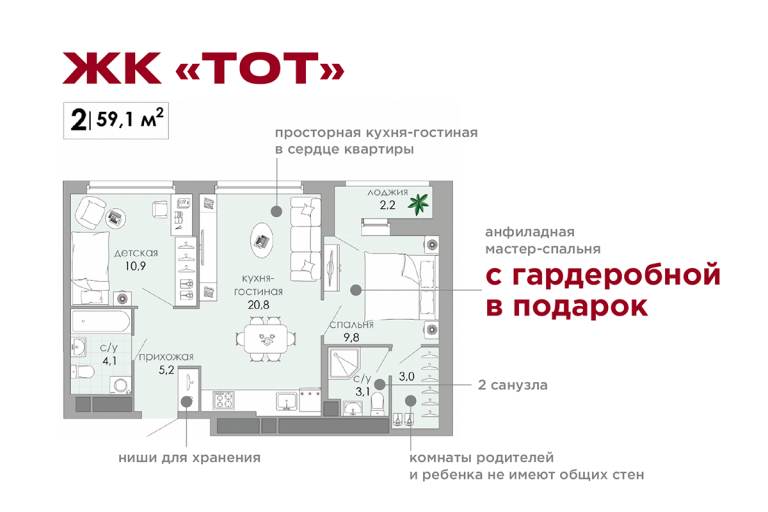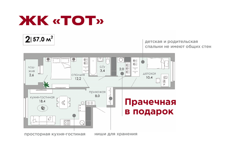 Например, в жилом квартале класса бизнес-лайт ТОТ доступна 2-комнатная квартира с окнами на 2 стороны и отдельной прачечной. Кроме того, в этой планировке детская и родительская комнаты не имеют общих стен, а значит, шумные игры ребенка не потревожат сон мамы и папы.