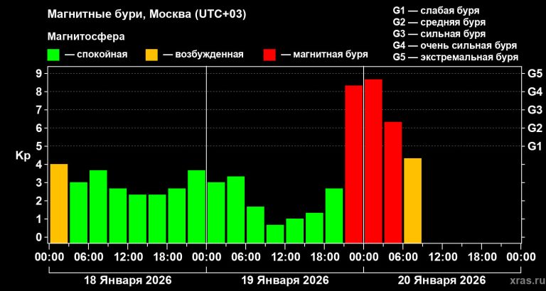 По полученным уже ночью данным, мощность магнитной бури превосходила отметку G4.5 — от есть, практически экстремальная магнитная буря. На данный момент геомагнитное возмущение продолжается.