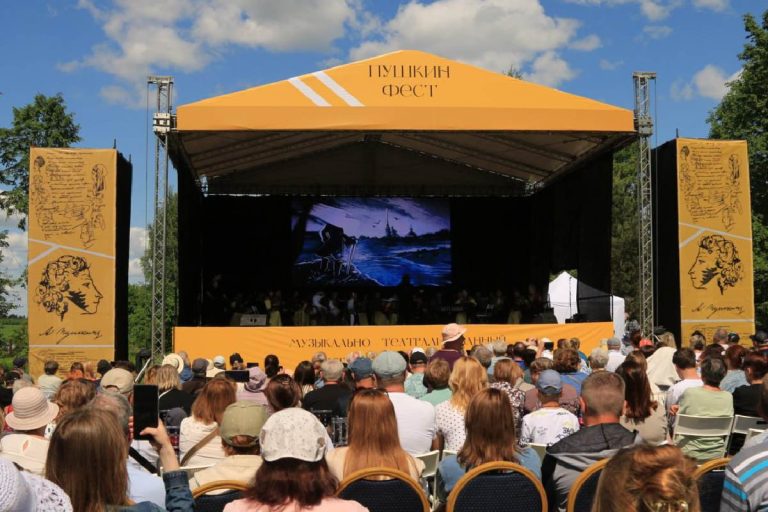 На Пушкинском празднике было открыто девять творческих площадок. На Центральной сцене впервые представлен совместный проект Государственного оркестра «Метелица» из Санкт-Петербурга и Государственного театра драмы и кукол «Святая Крепость» из Выборга – музыкально-поэтическая композиция «Медный всадник».