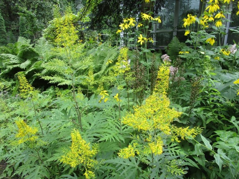 В Саду Души парка ТвГУ в самом разгаре цветения Бузульник тангутский (Ligularia tangutica) — растение, чьё имя хранит память о некогда существовавшей цивилизации. Его солнечно-жёлтые соцветия «взлетают» над резными листьями, а медовый аромат привлекает шмелей, пчёл и бабочек.