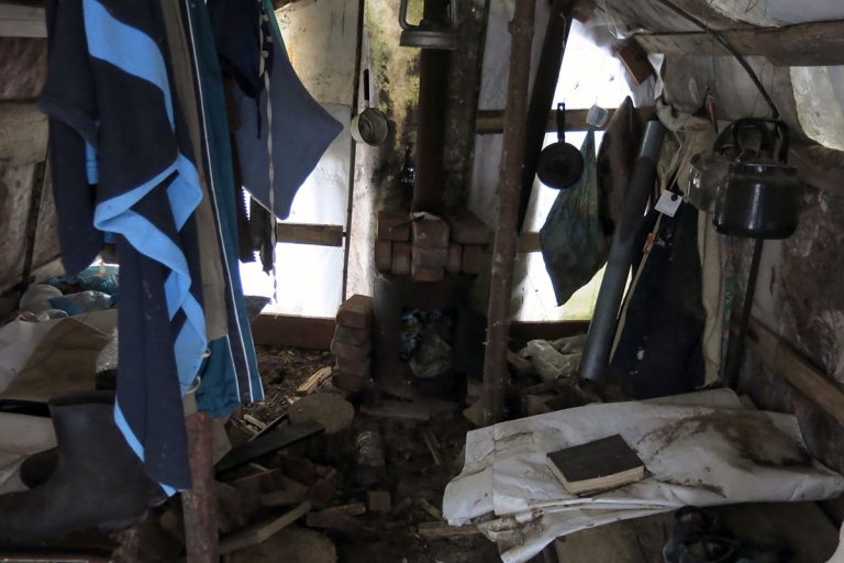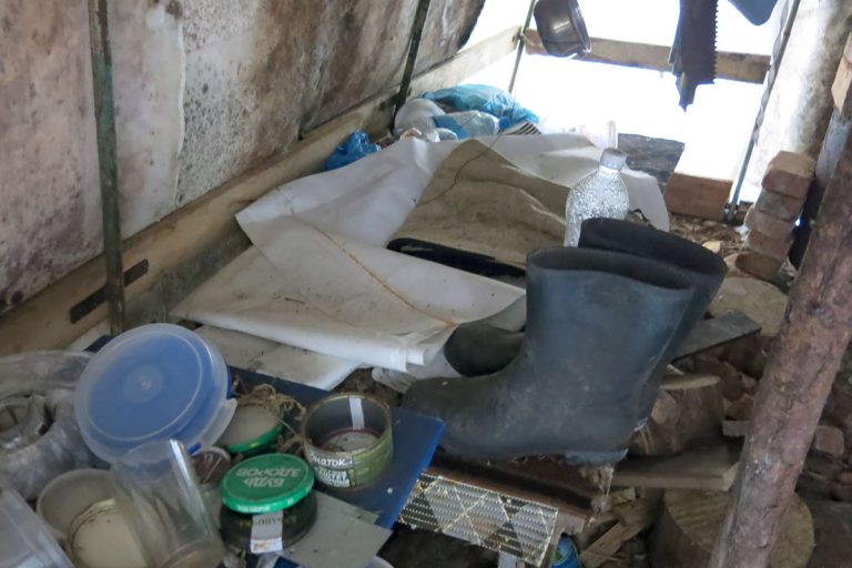 В самом домике оборудована печка-буржуйка, висят полотенца. На импровизированном столике — навал из грязной посуды и пустых консервных банок. А на лежанке кто-то позабыл собрание сочинения Карла Маркса и Фридриха Энгельса.