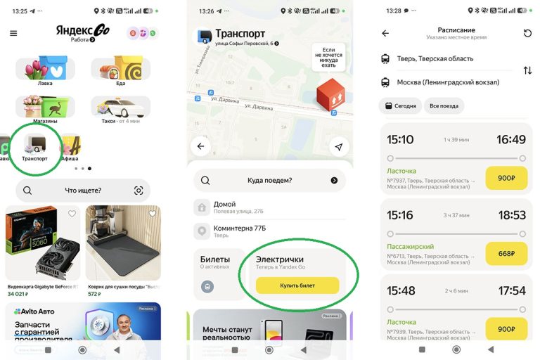 Этот способ — самый молодой из всех, но при этом один из самых универсальных. В первую очередь за счёт того, что у многих тверичан уже установлено приложение Яндекс Go, в котором также можно, например, заказать такси или доставку еды. Это большой плюс: не нужно переключаться между разными приложениями, особенно если маршрут составной и включает электричку и, например, поездку на такси от станции прибытия до конечной точки.