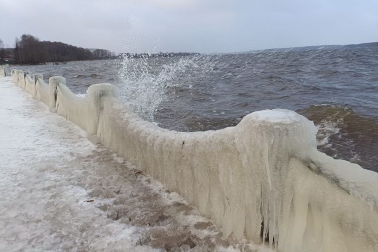 На снимках видна обледеневшая набережная Угличского водохранилища. Волны водоёма бились об ограждения и застывали причудливым образом.