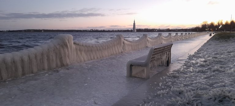 На снимках видна обледеневшая набережная Угличского водохранилища. Волны водоёма бились об ограждения и застывали причудливым образом.