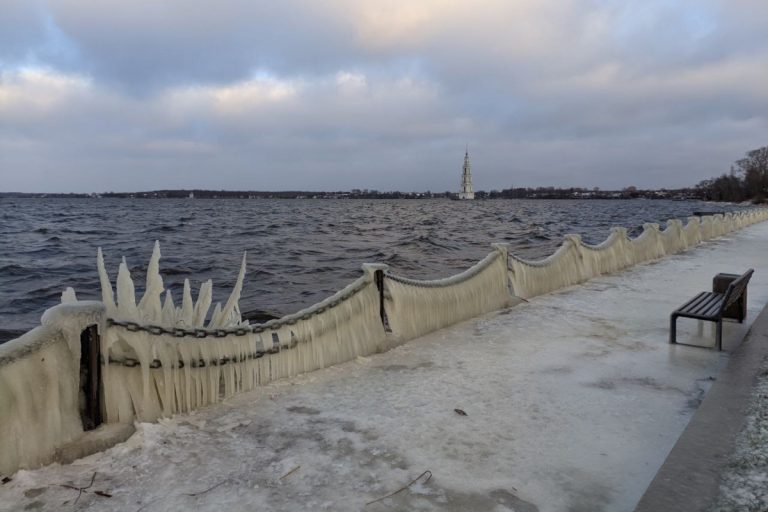 В Тверской области, как и прогнозировали синоптики, рекордное тепло сменилось арктическим холодом. На выходных в районах температура опускалась ниже -9 градусов. После плюсовых показателей резкое похолодание и сильный ветер создали удивительные ледяные пейзажи в Калязине. Фотографии опубликовали в соцсетях.