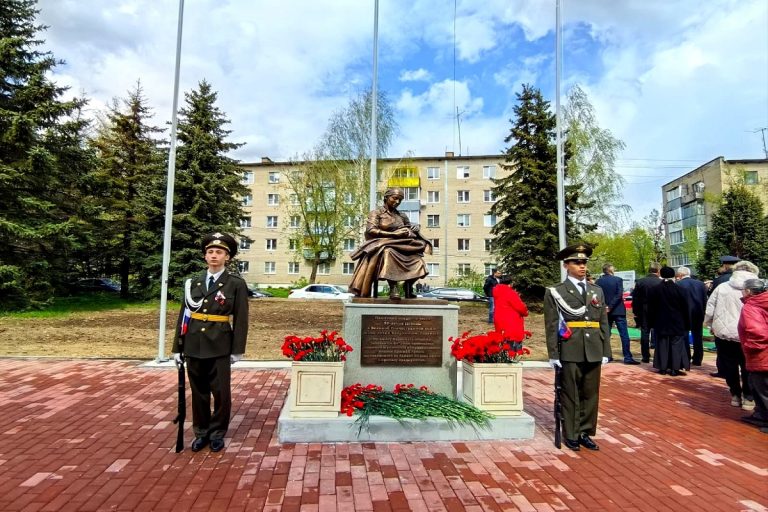 Скульптура изображает работницу, пошивающую военную форму, что символизирует вклад женщин в общее дело победы.