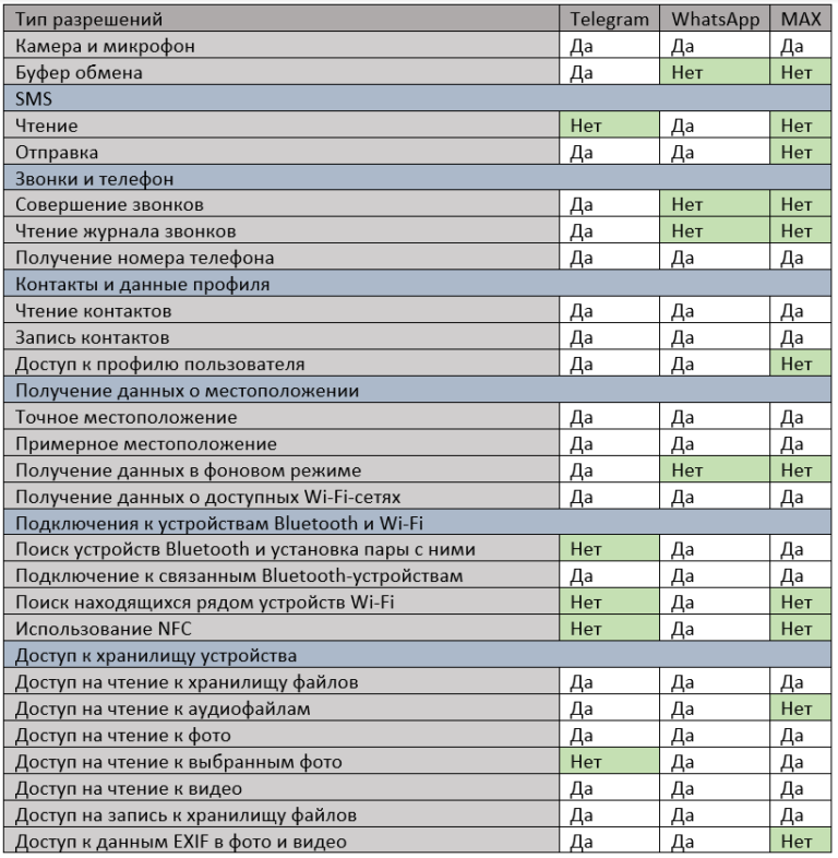 Кроме того, MAX не требует разрешения на доступ на чтение журнала звонков, к буферу обмена, чтению и отправке SMS. Приложение не запрашивает данные профиля пользователя и просит доступ к медиафайлам пользователя смартфона. Для примера в «Лаборатрии Касперского» составили сравнительную таблицу разрешений, запрашиваемых мессенджерами.