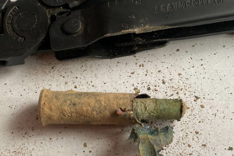 Как пояснили поисковики, это санитарное захоронение было расположено в неглубокой воронке. Они обнаружили личные вещи и амуницию, в том числе нож, мундштуки, ботинки, пехотную лопатку, остатки ремней и др.