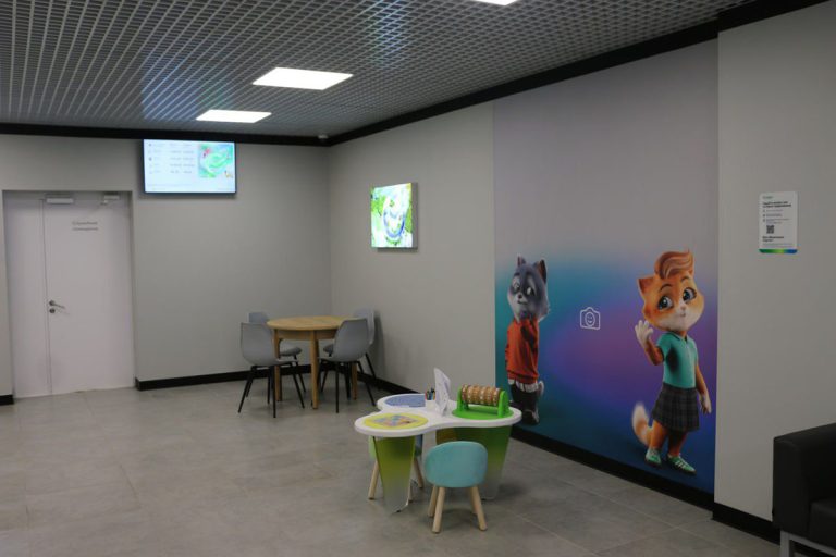 Пространство отделения стало более открытым и удобным для посетителей: большинство услуг можно получить в любой удобной локации. Появилась игровая зона для детей.