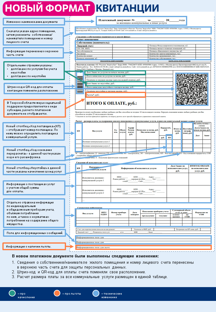 Обращаем внимание, что изменения касаются исключительно внутреннего содержания и структуры квитанции. Порядок начисления платежей, применяемые тарифы и реквизиты компании остаются неизменными.