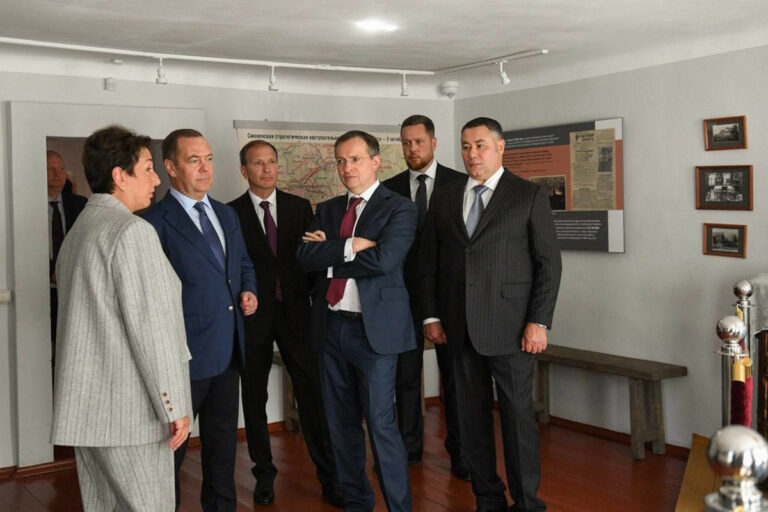 Дмитрий Медведев, Владимир Мединский и Игорь Руденя в городе воинской славы Ржеве посетили Покровский храм, с которым связана история освобождения жителей Ржева в годы Великой Отечественной войны. Репортаж, где раскрыта эта тема читайте здесь – Ставка Сталина, спасительная церковь и дочь маршала: репортаж с 80-летия освобождения Ржева от фашистов.