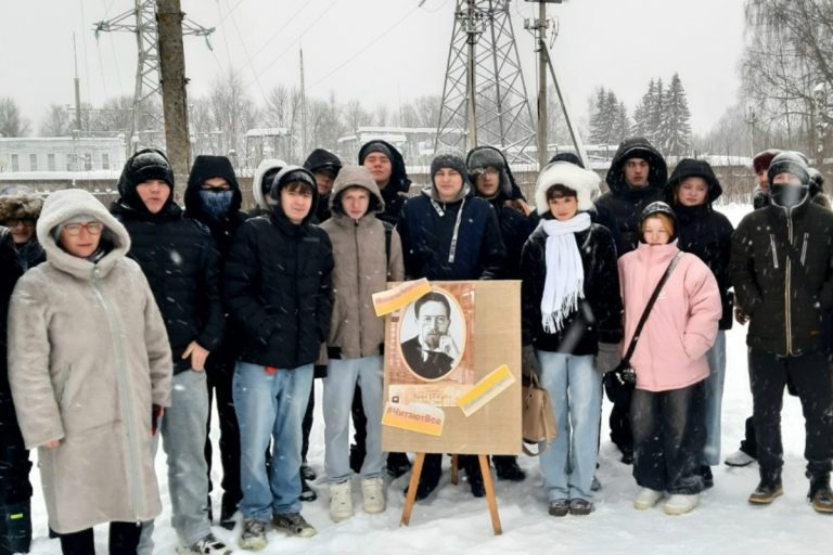 Студенты промышленно-гуманитарного колледжа вместе со своим наставником О.Е. Новожиловой собрались на улице, носящей имя Чехова.