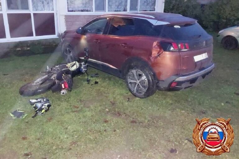 13-летний водитель мотоцикла двигался по грунтовой дороге, но наехал на булыжник. В итоге произошло столкновение со стоящим Peugeot 3008.