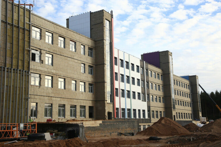 Сейчас на объекте трудится 180 специалистов, задействовано 14 единиц техники. Ведутся работы по устройству кровли и фасада здания, перегородок, стяжки пола, монтажу окон, внутренних инженерных и наружных сетей.