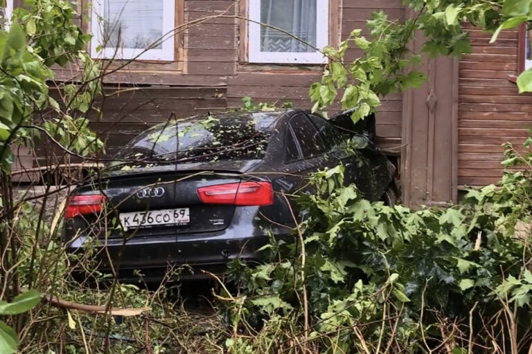 Водитель автомобиля Audi A6 по неустановленной причине не справился с управлением и врезался в частный двухэтажный жилой дом, пробив в нём фундамент. Очевидцы утверждают, что водитель даже не пытался затормозить.