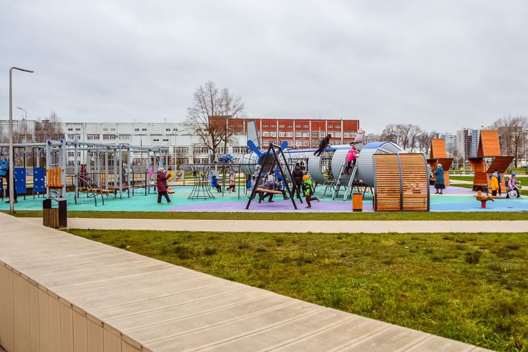 На новой детской площадке в Парке Победы игровые элементы разделены по зонам для разного возраста. Есть песочница с полосой препятствий для малышей, территория для детей с ограниченными возможностями здоровья и основной игровой комплекс для детей 4-12 лет со множеством развивающих компонентов.