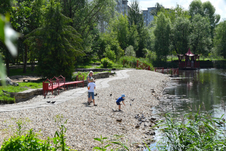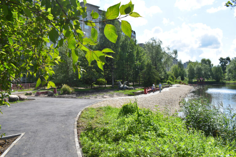 Сейчас по муниципальному контракту расчистили берег пруда со стороны скульптуры «Дракон». Кроме того, сделали планировку территории и укрепили береговую линию с щебнем разных фракций. Помимо этого, закончили обустраивать дорожки из железобетонных плит с гравием в межплиточном пространстве и восстановили асфальтовую пешеходную зону.