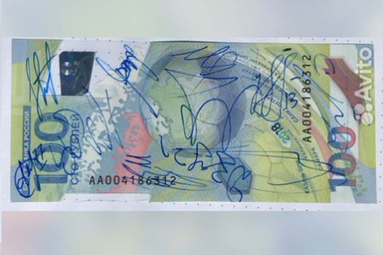 Житель Центрального района Твери продает редкую банкноту номиналом 100 рублей, выпущенную к Чемпионату мира по футболу 2018. Особенностью купюры является то, что она подписана автографами футболистов и главного тренера сборной России.