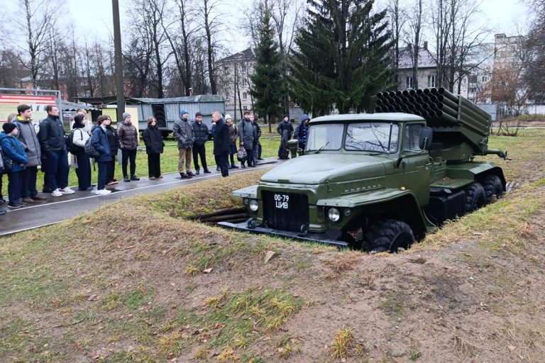 Внимание учащихся было обращено на постамент знаменитой «Катюши», как символа и родоначальницы ракетной артиллерии. Демонстрационные артиллерийские пушки, минометы, реактивные снаряды, боевая машина «Град» в капонире — всё это вызвало у ребята неподдельный интерес.