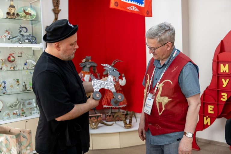 Руководитель Тверского театра кукол Виталий Салтыков вручил директору Музея козла Владимиру Лавренову уникальную статуэтку парнокопытного, сделанную руками столяров и художников этого театра.