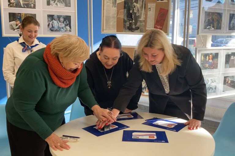 Первыми оттиск штемпеля на марку поставили актрисы Тверского академического театра драмы, народные артистки РФ Ирина Андрианова и Вера Рычкова, а также директор УФПС Тверской области Ольга Беляцкая.