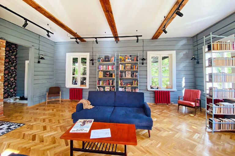 В избе представлены книги, настольные игры. В целом в гостиничном комплексе «1898: Дом отдыха и чтения» десять домов, на территории обустроены пруд, бассейн, дорожки для игры в петанк.