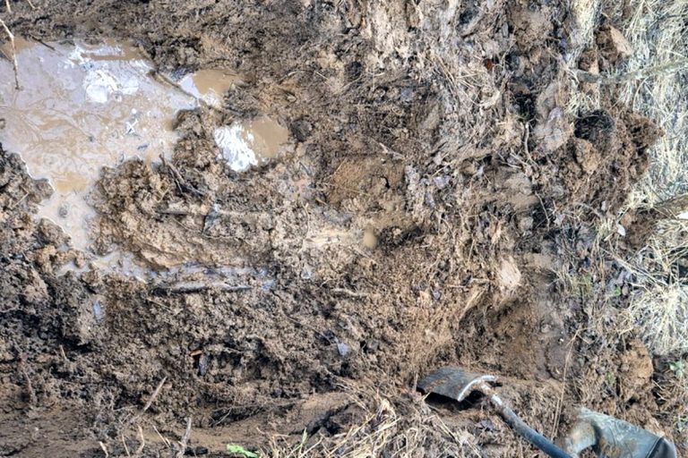 «В бруствере немецкой траншеи «назвонили» фрагмент малой пехотной лопатки. Начали расширяться и пошли фрагменты останков нашего солдата. Из личных вещей были найдены 2 гильзы от патронов к винтовке Мосина, одна монета, фрагменты одежды и перевязочный пакет»,