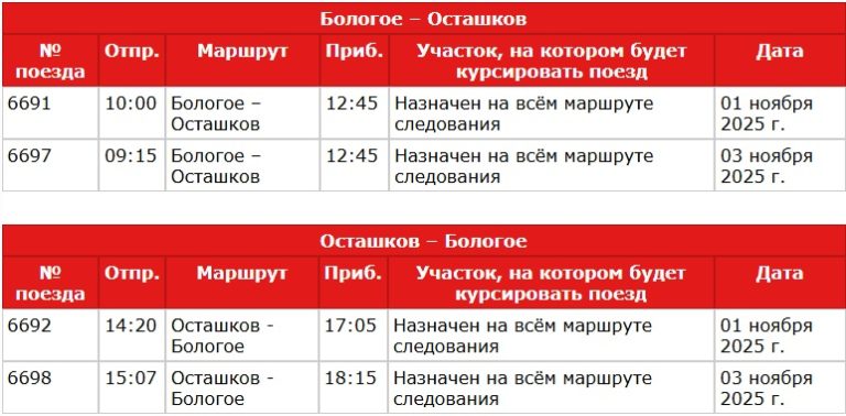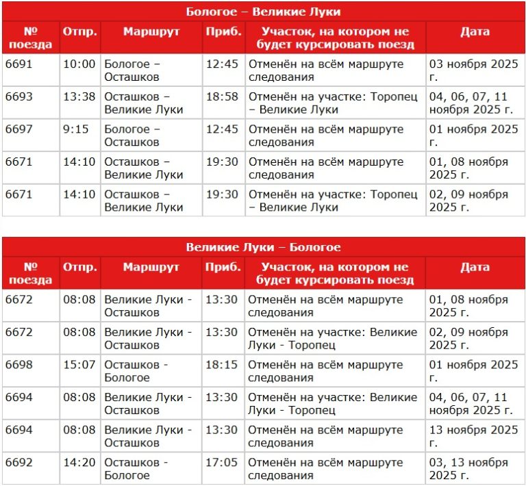 Часть пригородных поездов на участке Бологое – Великие Луки – Бологое будет отменена на всем маршруте следования, а часть – проследует укороченным маршрутом. Изменения в расписании коснулись следующих поездов: