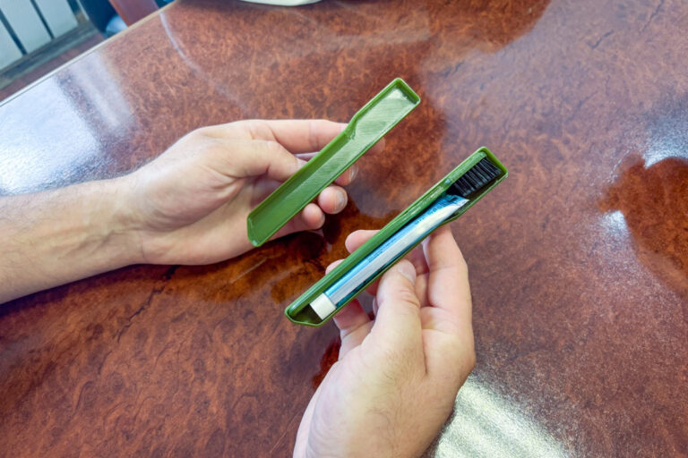«Тестовый набор представляет собой герметичный пенал, в который входит небольшая, но удобная щетка нового «походного» дизайна с уникальной запатентованной разработкой Александра – щетина срезана наискосок, что позволяет эффективно очищать дальние зубы. В комплект также входит качественная зубная паста в небольшом тюбике. Такой набор обеспечивает полноценную гигиену даже в полевых условиях. Первые испытания показали, что комплекта хватает не менее чем на полтора месяца без потери качества»,