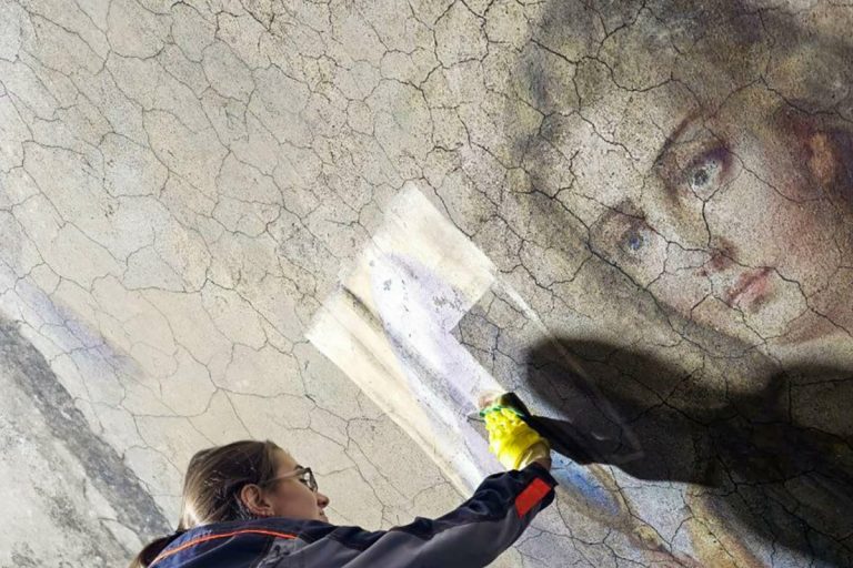 «Художники-реставраторы приступили к удалению слоя загрязнений и чёрной копоти, практически полностью закрывающей авторский красочный слой. Параллельно с этим ведется работа по удалению нахлёстов реставрационных вставок, заходящих на авторский красочный слой. Были освобождены от штукатурных наслоений границы авторского красочного слоя по всему периметру барабана. Реставрационные вставки, заходящие на авторский штукатурный слой, удалялись при помощи скальпеля с особой осторожностью. В результате удалось раскрыть значительные части росписи от штукатурных наслоений»,