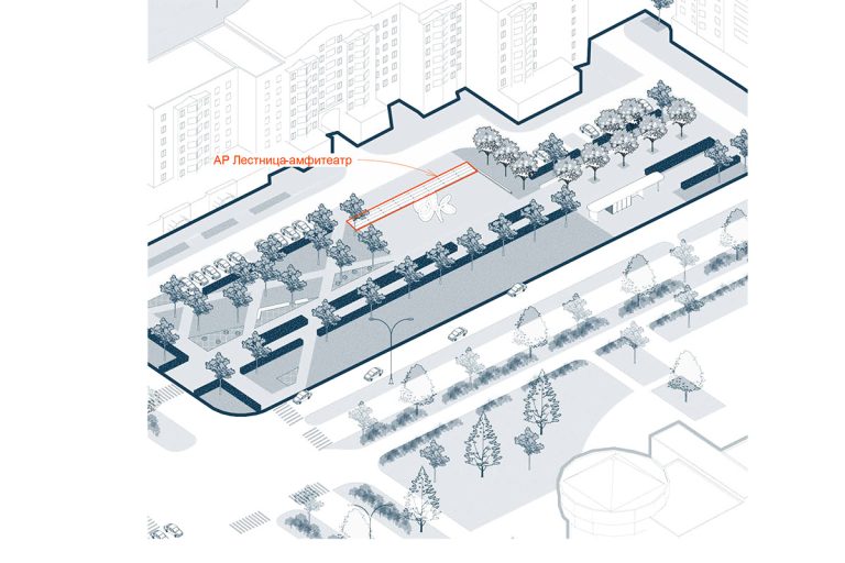 «Лестница-амфитеатр представляет собой лестницу, включающую подпорные стенки. Конструкция лестницы состоит из железобетонного основания и облицовки тротуарной плиткой», — говорится в проектной документации.