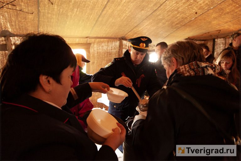 Кроме того, всех желающих в праздничный день на станции накормили кашей, приготовленной на полевой кухне. А чтобы люди не мокли под дождём и мокрым снегом, полевая кухня была развёрнута под специальным шатром.