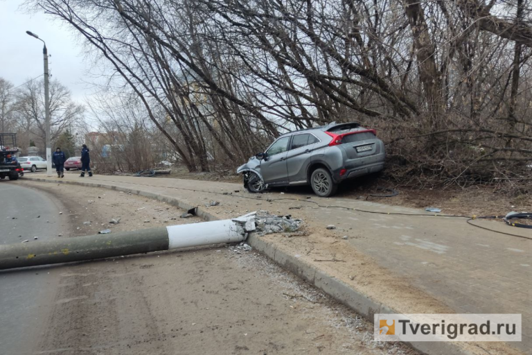 Водитель на Mitsubishi протаранил бетонный столб в Твери