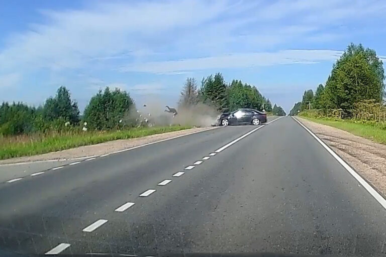 Момент столкновения попал в объектив видеорегистратора. На записи видно, что водителя Renault выбросило из салона авто. Вероятнее всего, он не был пристёгнут ремнём безопасности.