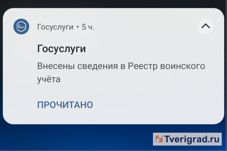 Жителям Тверской области, которые зарегистрированы на портале «Госуслуги», начали приходить уведомления от сервиса о включении в Реестр воинского учёта. Эта система перешла из тестового в штатный режим работы в мае этого года.