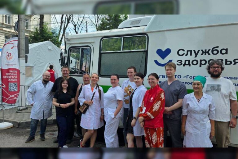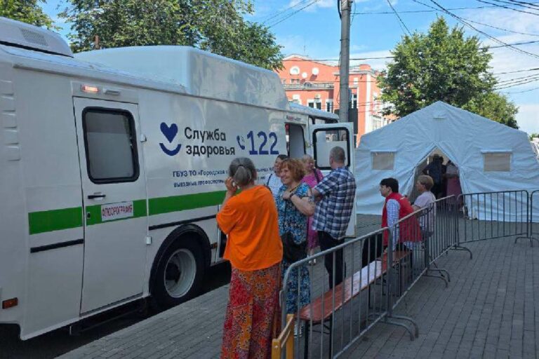 Мобильный медицинский комплекс горбольницы №6 действовал перед зданием библиотеки им. А.М. Горького.