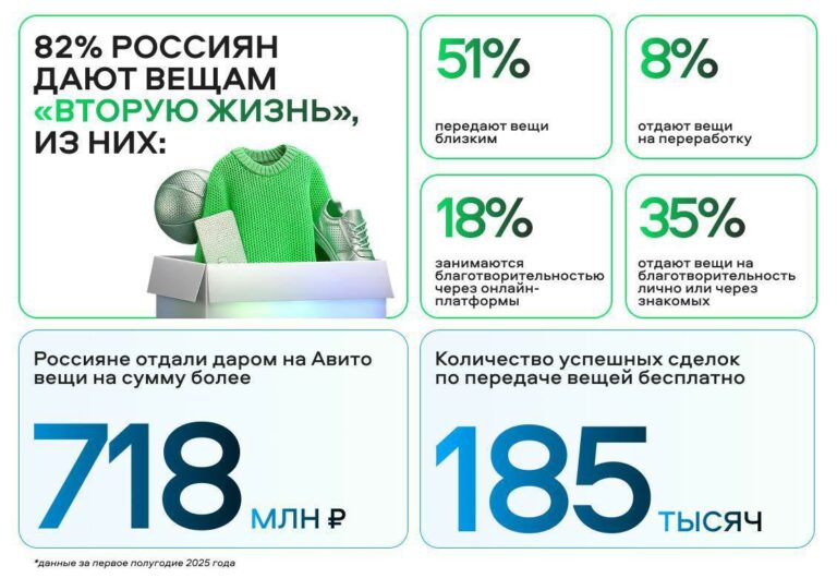 За первое полугодие 2025 года россияне совершили более 185 тысяч успешных сделок по передаче вещей бесплатно через технологическую платформу Авито.