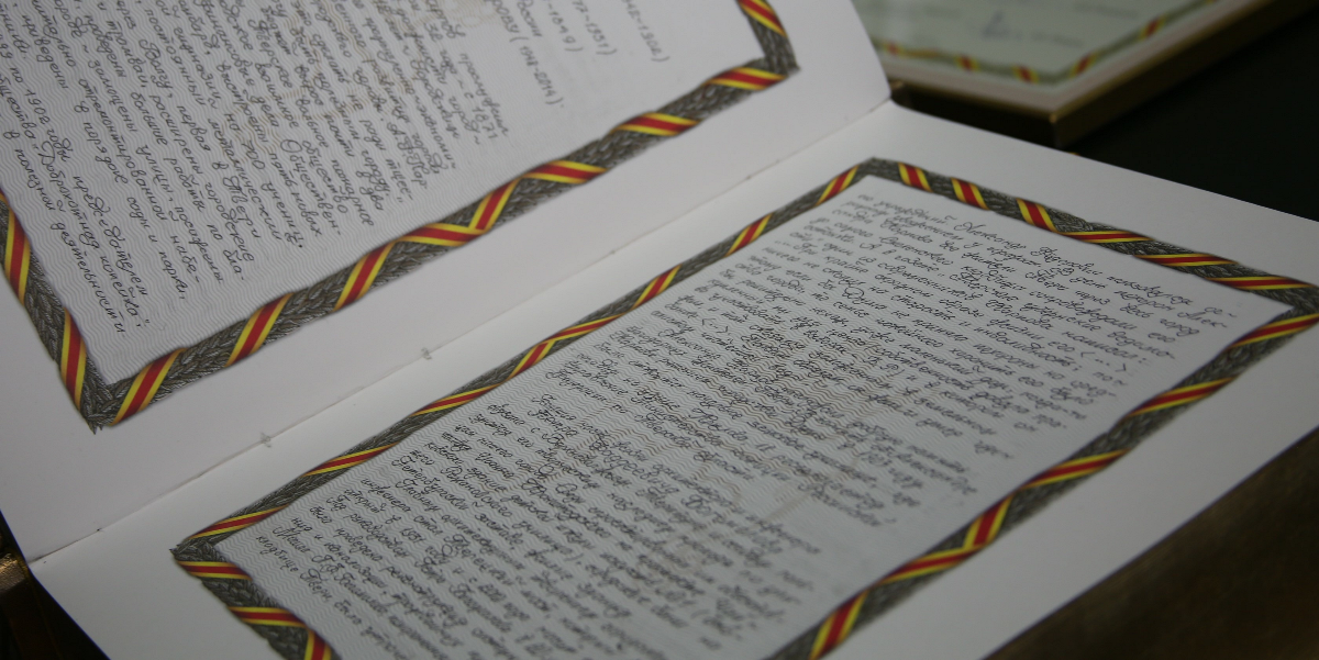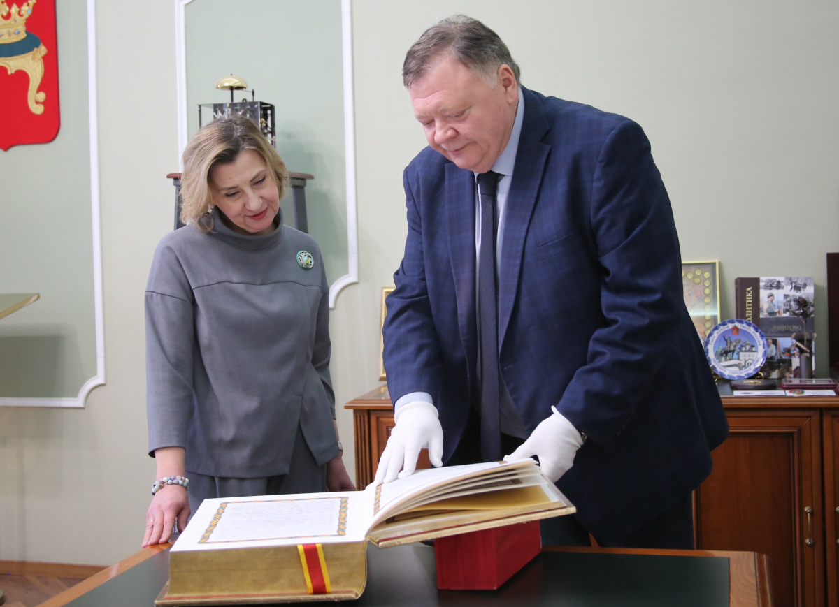 Традиционно на мероприятии инициаторам и потомкам лауреатов Золотой книги вручаются памятные свидетельства. Наталья Руф тогда не смогла присутствовать на торжественной церемонии. Поэтому на этой неделе и была приглашена в Тверскую городскую Думу, где хранится фолиант. Евгений Пичуев передал Наталье Арнольдовне свидетельство, рассказал об истории создания Золотой книги Твери и показал саму запись о Петре Богомолове.